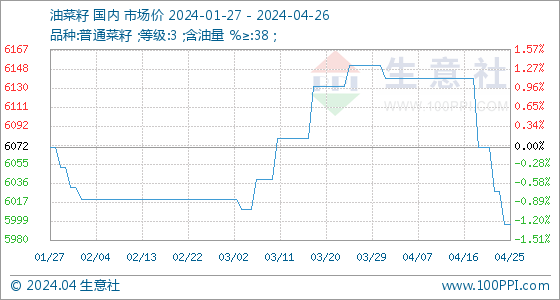 4月26日生意社油菜籽基准价为5996.00元/吨