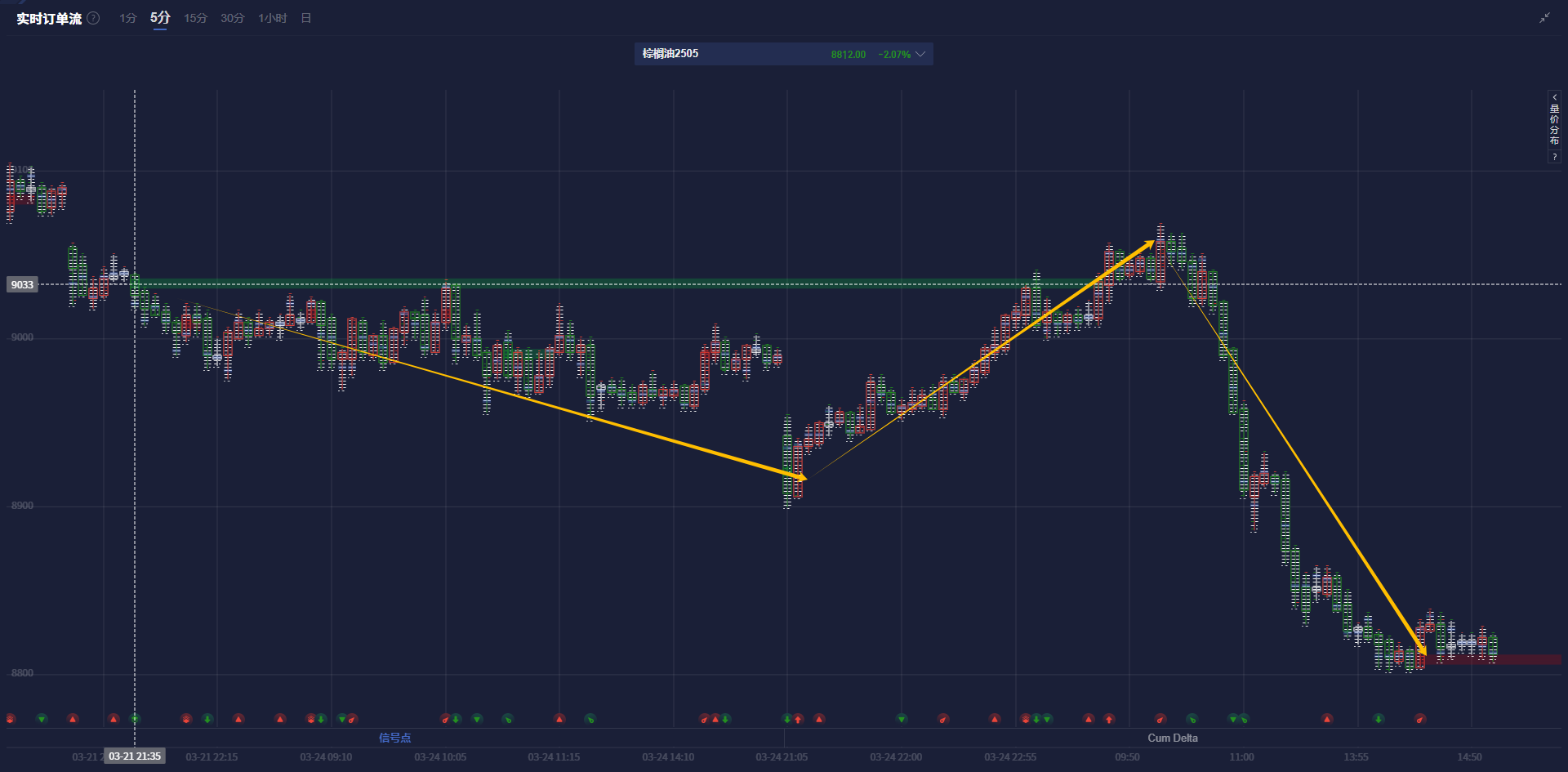 棕榈油盯盘神器-资金炸弹功能(点击链接体验)在3月14日上午10:32和10:34捕捉到两个主卖资金炸弹,但由于资金炸弹的主卖占比并未超过60%,所以未能推动下跌行情,且价格有所上涨。但结合1小时图给到的交易信号,并根据交易信号更大可能制定中性偏空策略的预期,因此这两个资金炸弹主要作用是提醒投资者需要关注未来是否有入场机会。结合棕榈油盯盘神器-实时订单流功能(详看上方的订单流图2),最终捕捉到夜盘开始的下跌行情。