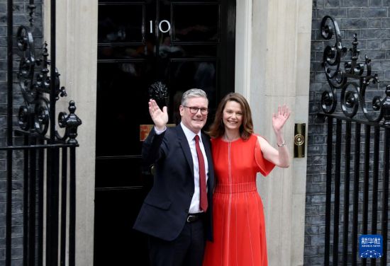 7月5日,基尔·斯塔默发表讲话后与妻子在英国伦敦唐宁街10号首相府前挥手致意。 新华社记者 李颖 摄