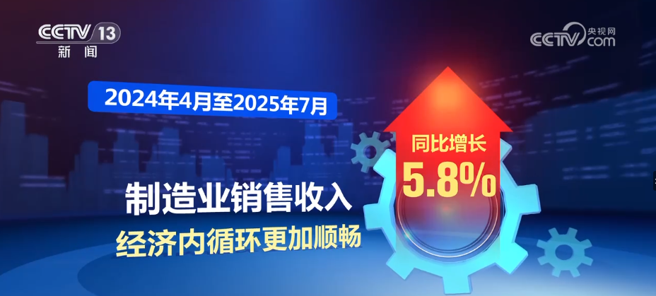 数据显示,“两新”政策实施以来,全国零售业需求持续增长,带动制造业企业加力推进设备更新升级,形成从政策驱动到需求释放、再到产业升级的良性互动。2024年4月至2025年7月,制造业销售收入同比增长5.8%,经济内循环更加顺畅。