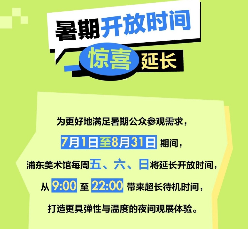 上海浦东美术馆也宣布,7月1日至8月31日期间,每周五、六、日将延长开放时间至22:00(周一至周四开放至21:00)。