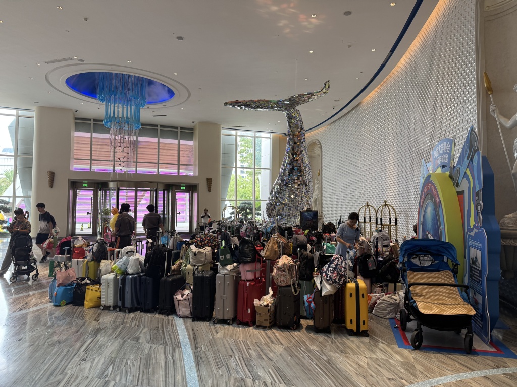 此外,澎湃新闻在海昌海洋公园度假酒店内看到,大堂内寄存的行李箱摆得满满当当;前台办理入住的柜台处,每个柜台前都排着长队。