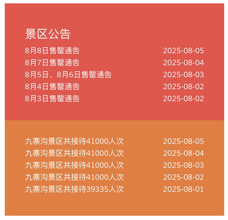 如进入8月以来,截至8月5日,九寨沟景区已连续4日达到游客最大承载量。截至8月5日06:00,九寨沟景区8月8日前(含8月8日)的门票均已售罄。