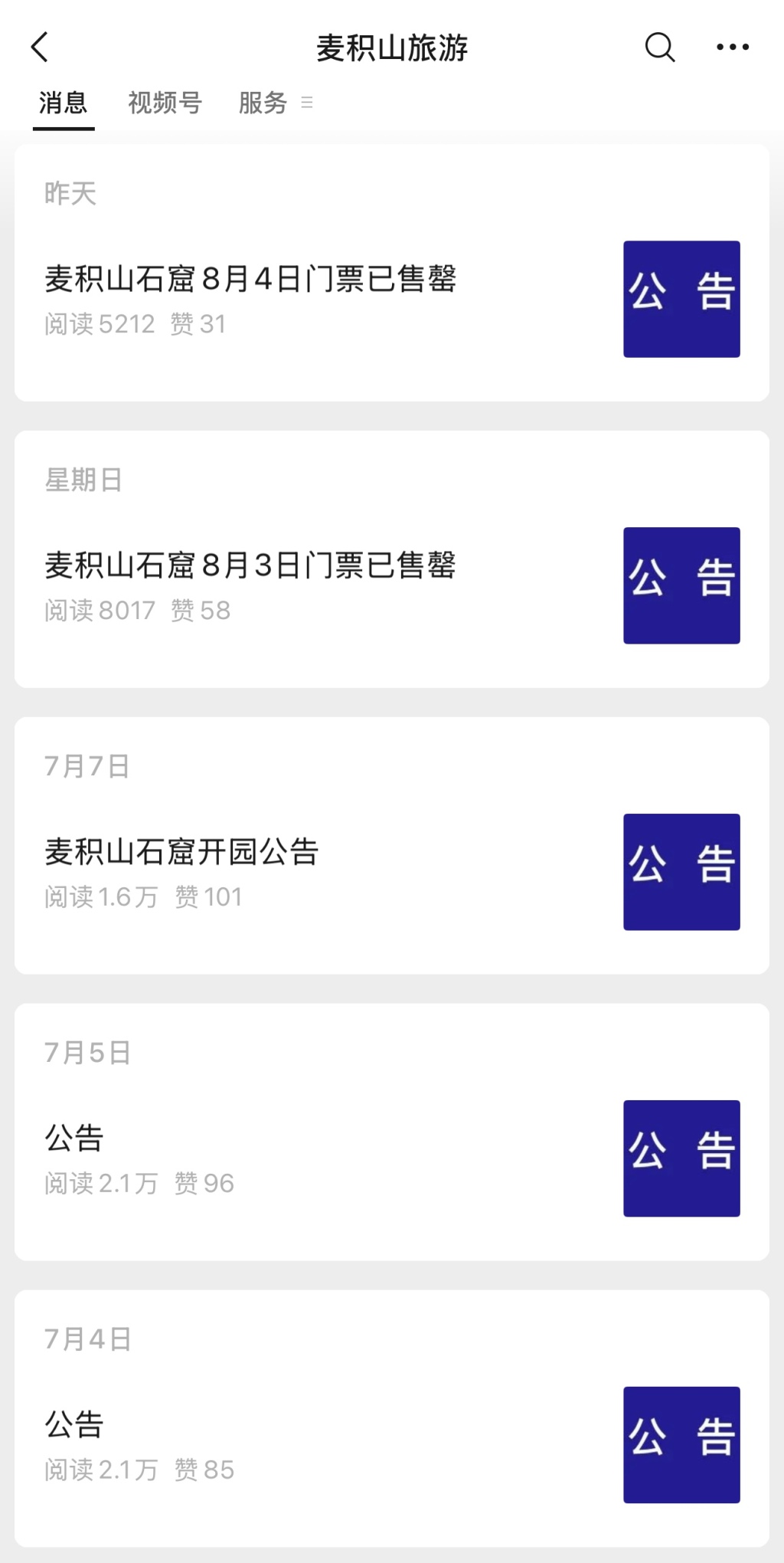 8月3日和4日,麦积山石窟也都在一早就发布公告称当日门票售罄。