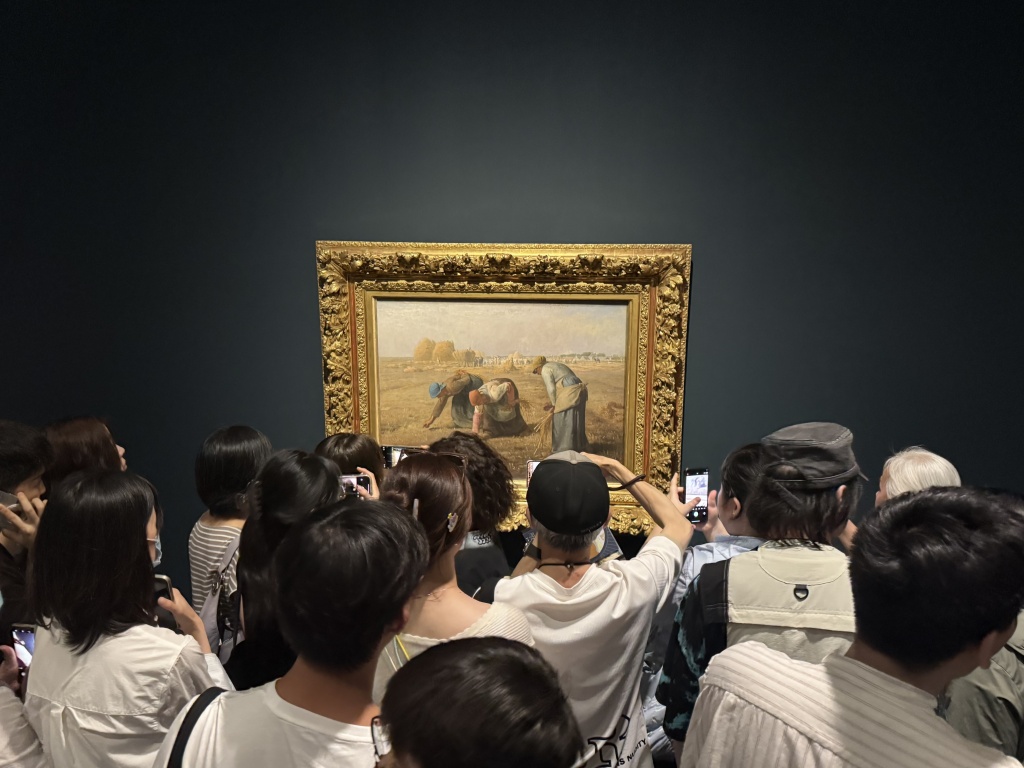上海浦东美术馆内,游客们正在欣赏法国画家让·弗朗索瓦·米勒的《拾穗者》。