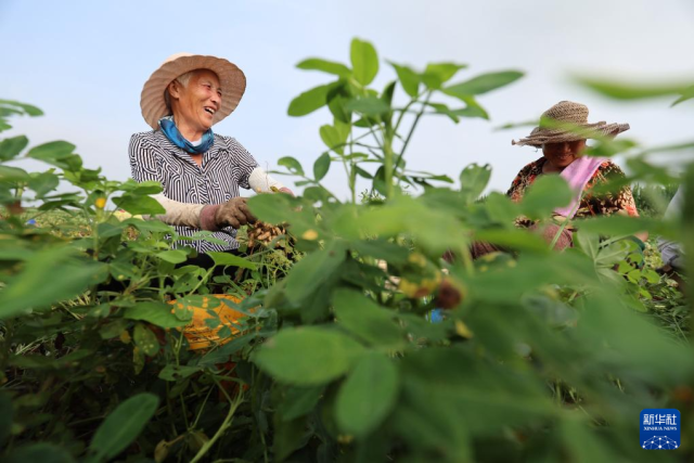 8月7日,在河北省石家庄市正定县良下村,农民忙着采收花生。