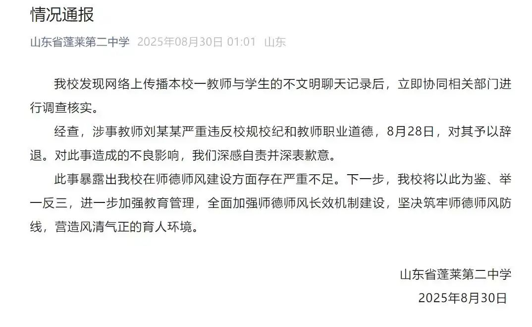 ·山东省蓬莱第二中学通报:一教师与学生不文明聊天被辞退。
