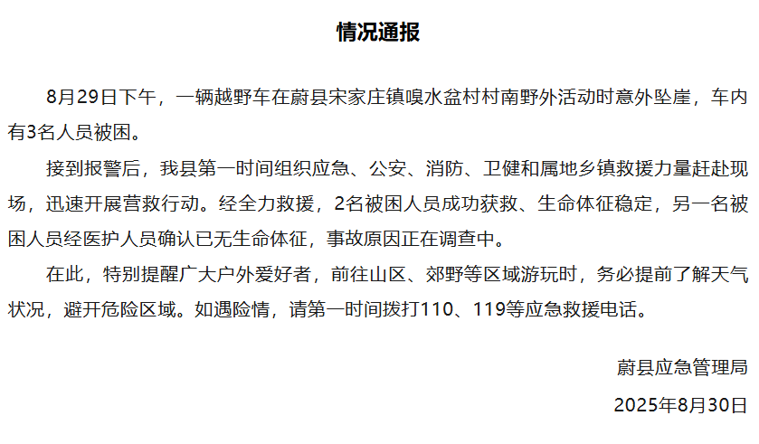 ·河北蔚县通报“越野车意外坠崖致3人被困”:2人获救1人去世。