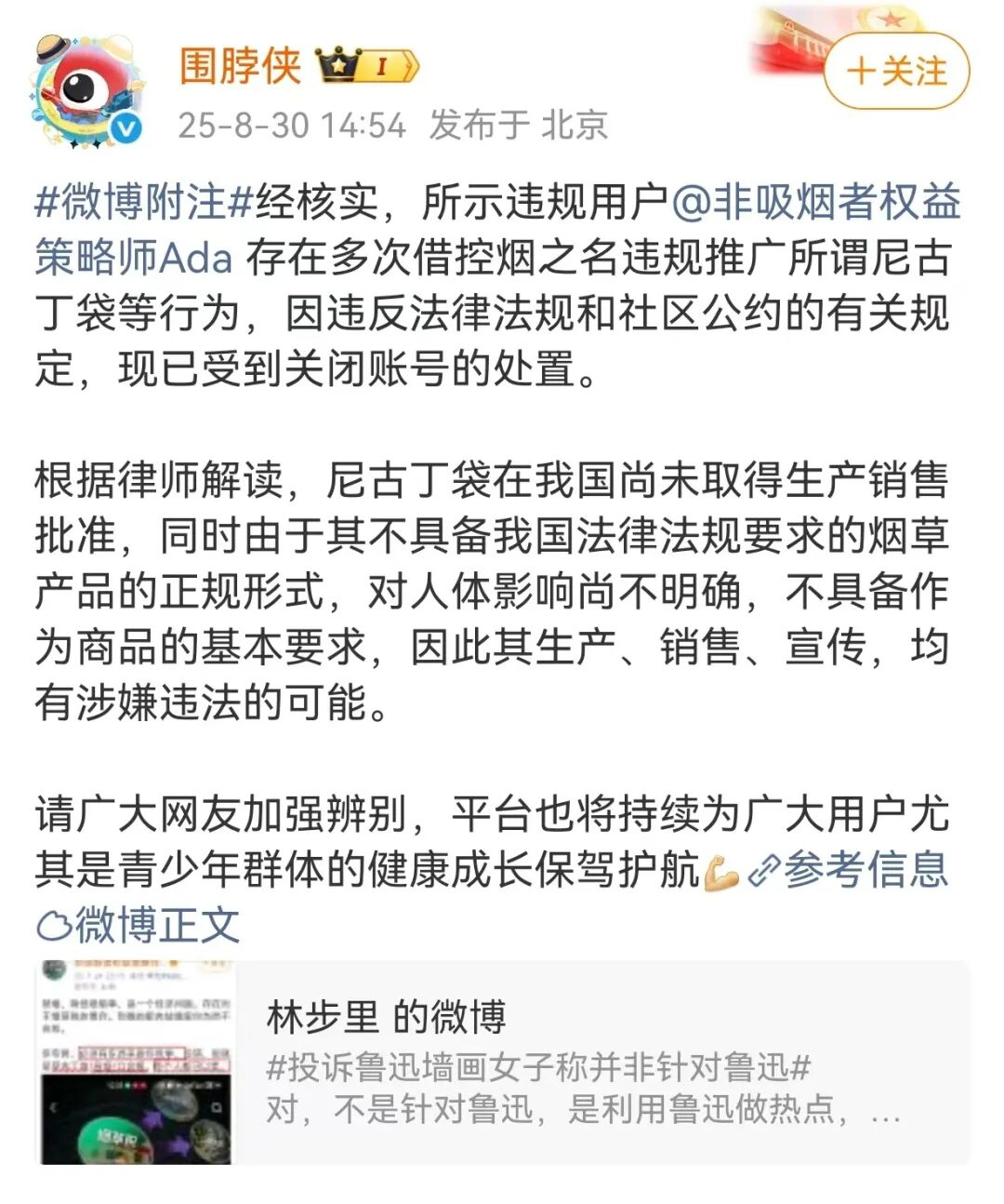 ·投诉鲁迅夹烟墙画当事人道歉后账号已被封。微博回应:多次借控烟之名违规推广所谓尼古丁袋。