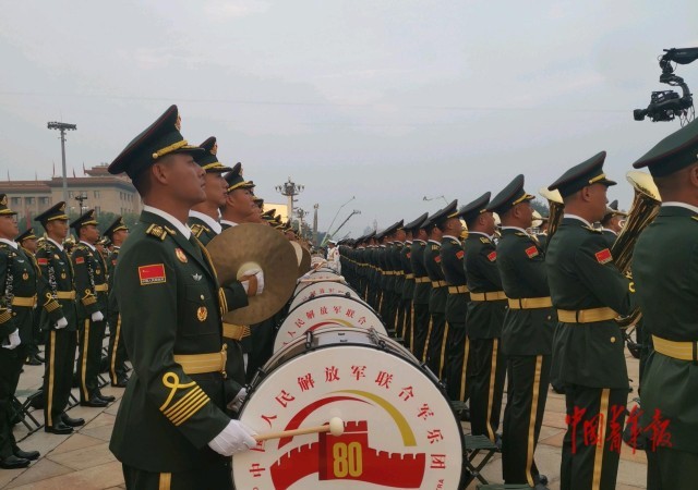 9月3日早晨,北京,中国人民解放军联合军乐团在天安门广场排练。当天,纪念中国人民抗日战争暨世界反法西斯战争胜利80周年大会将在北京隆重举行。中青报·中青网记者 张国/摄