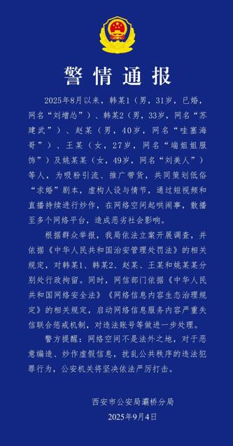 ·吸粉引流、推广带货,策划低俗“求婚”剧本,西安市灞桥警方:5人被行拘。