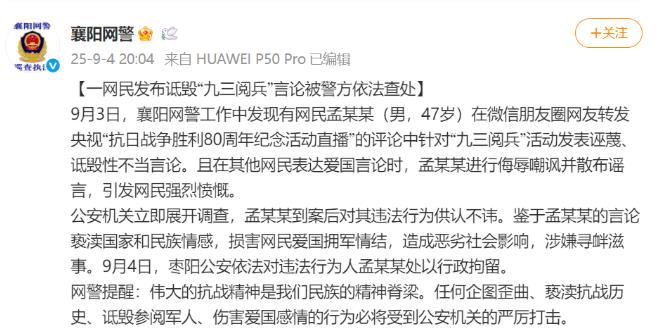 ·湖北襄阳网警:一男子发布诋毁九三阅兵言论被行政拘留。