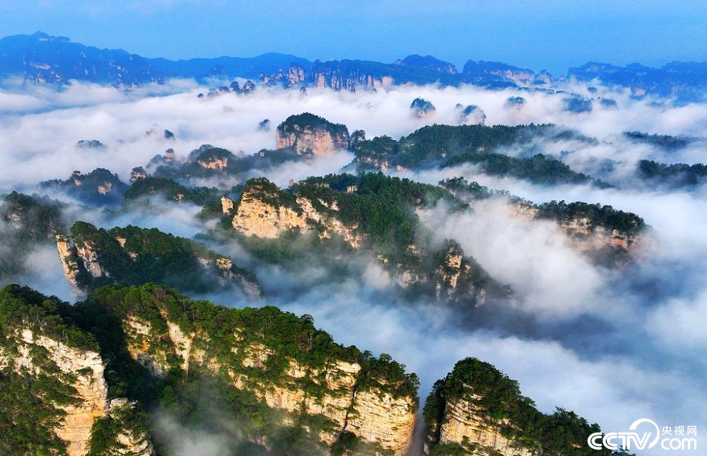 ·9月3日,张家界国家森林公园黄石寨、腰子寨、天子山等景点在初升阳光照耀下,云海在峰林间翻滚。
