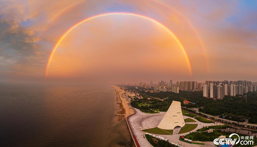 ·9月3日,山东烟台,傍晚出现东边彩虹西边彩霞的奇异天气现象。