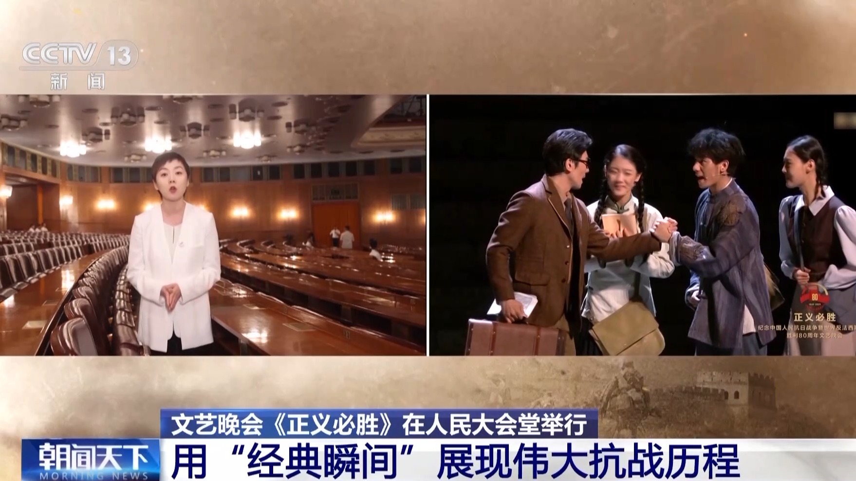 3日晚,纪念中国人民抗日战争暨世界反法西斯战争胜利80周年文艺晚会《正义必胜》在人民大会堂举行。