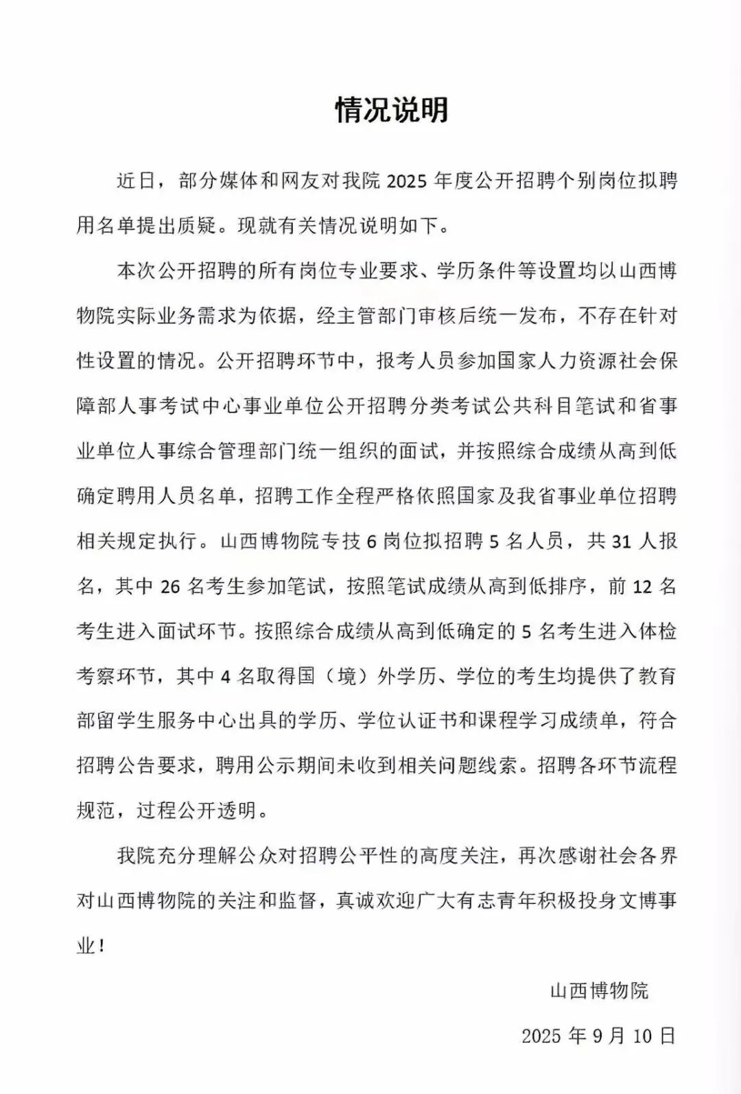 ·山西博物院回应“拟聘用名单遭质疑”:招聘流程规范,过程公开透明。