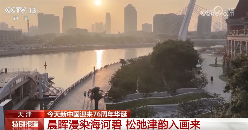 跟随镜头我们来到天津,您现在看到的正是蜿蜒穿城的海河。晨光洒下,粼粼河面被镀上了一层暖金色。世纪钟的指针轻叩时光,唤醒城市的清晨;晨练的人们活力满满,有的迈着轻快步伐慢跑,有的伴着音乐舒展肢体。河海津韵的独特魅力就藏在这晨光、流水与惬意里。
