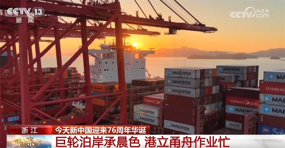 一轮红日出东海,万吨巨轮作业忙。现在画面中我们看到的是宁波舟山港梅山港区,矗立在码头边的大型桥吊迎着朝阳,挥舞着巨大的手臂,在船与岸之间精准作业。宁波舟山港是我国重要的集装箱远洋干线港,港口年货物吞吐量连续16年蝉联全球第一。